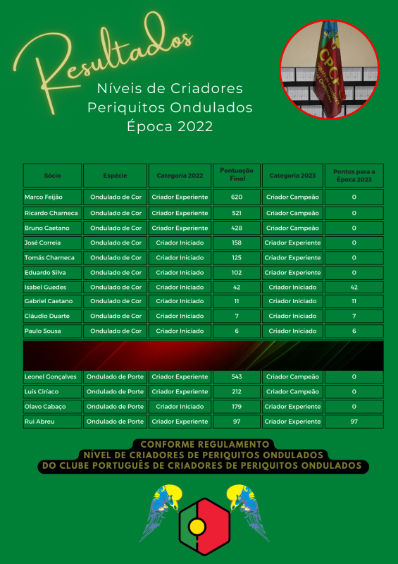 Terminada a época de 2022, é altura de fazer o balanço e apresentarmos os resultados dos nossos sócios nas exposições, segundo o Regulamento de Níveis de Criadores de Periquitos Ondulados, implementado pelo CPCPO em 2022.